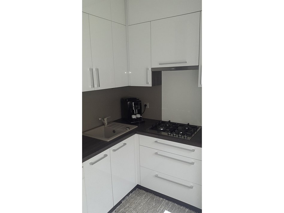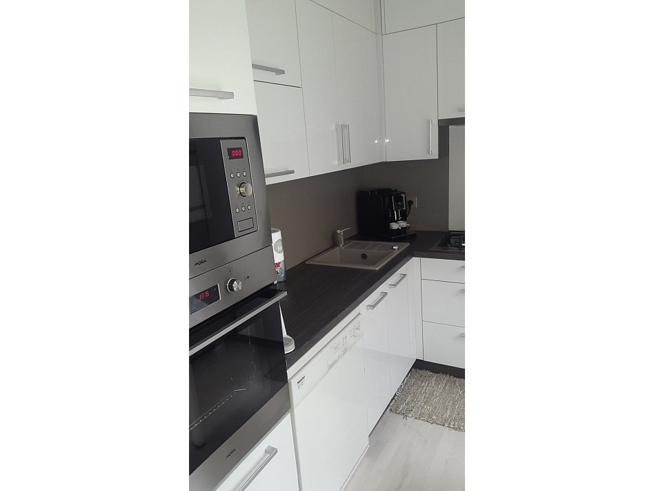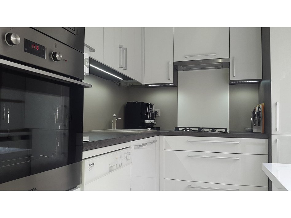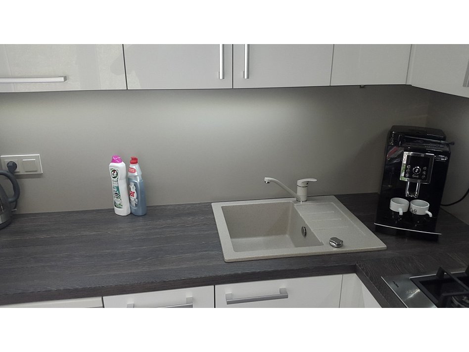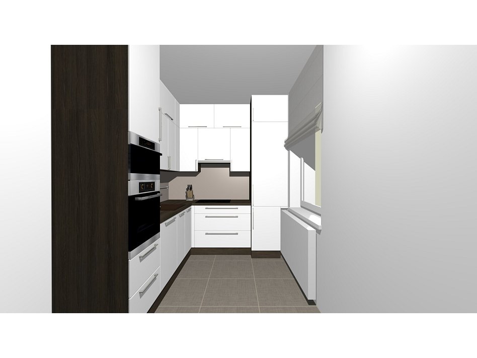 Při návrhu kuchyně jsme byli značně omezeni prostorem malého panelákového bytu. Proto jsem navrhnul bílou lesklou barvu s kombinací krémové a tmavé pracovní desky, tím jsem docílil toho že kuchyně nijak pocitově nezmenšuje prostor.