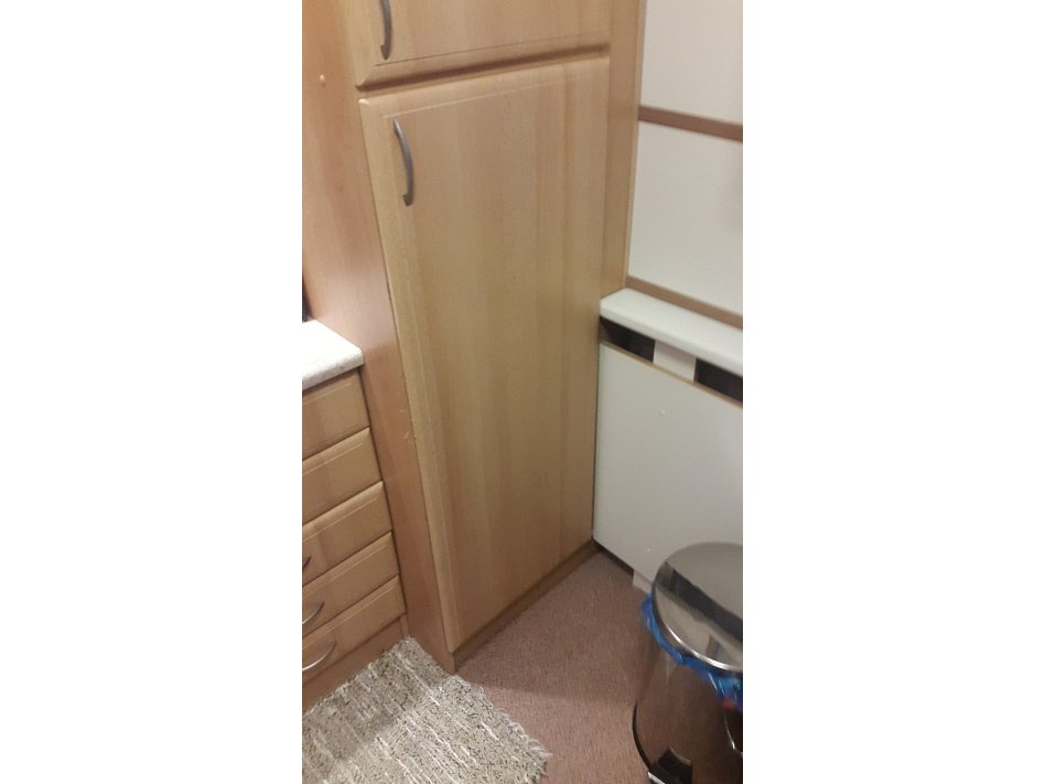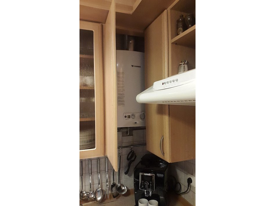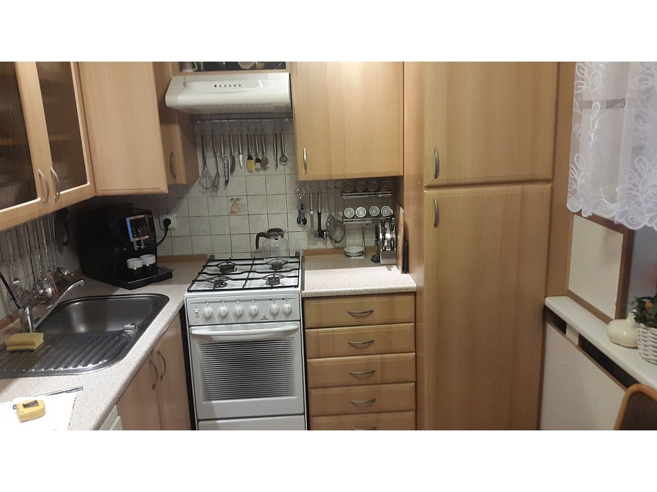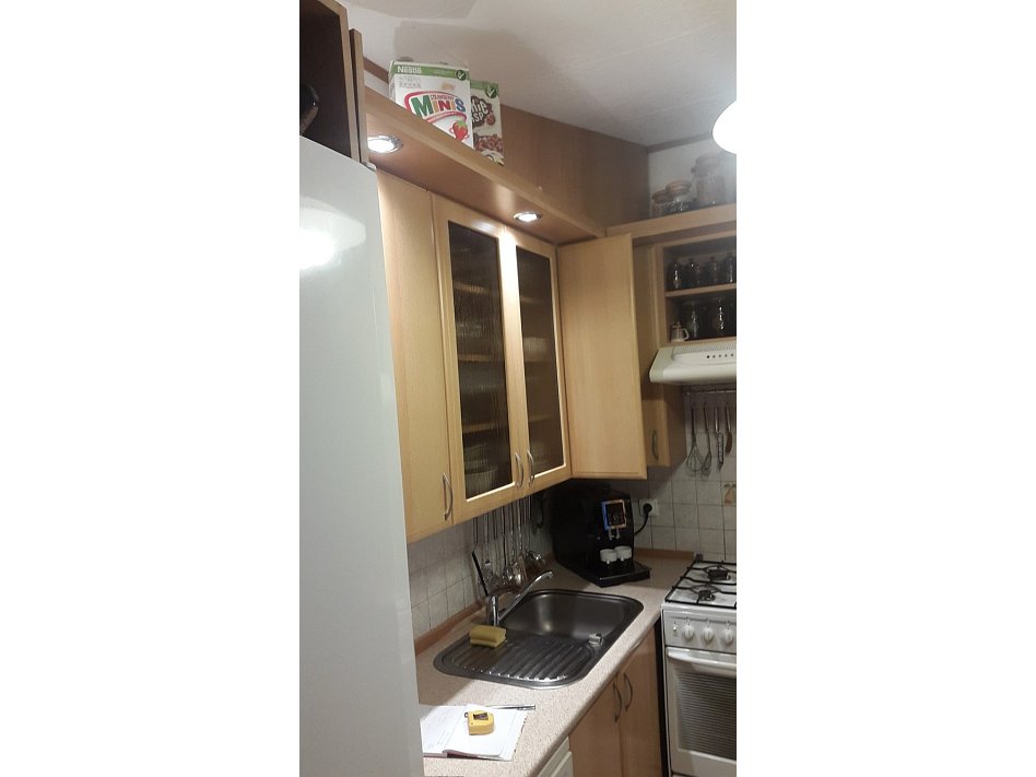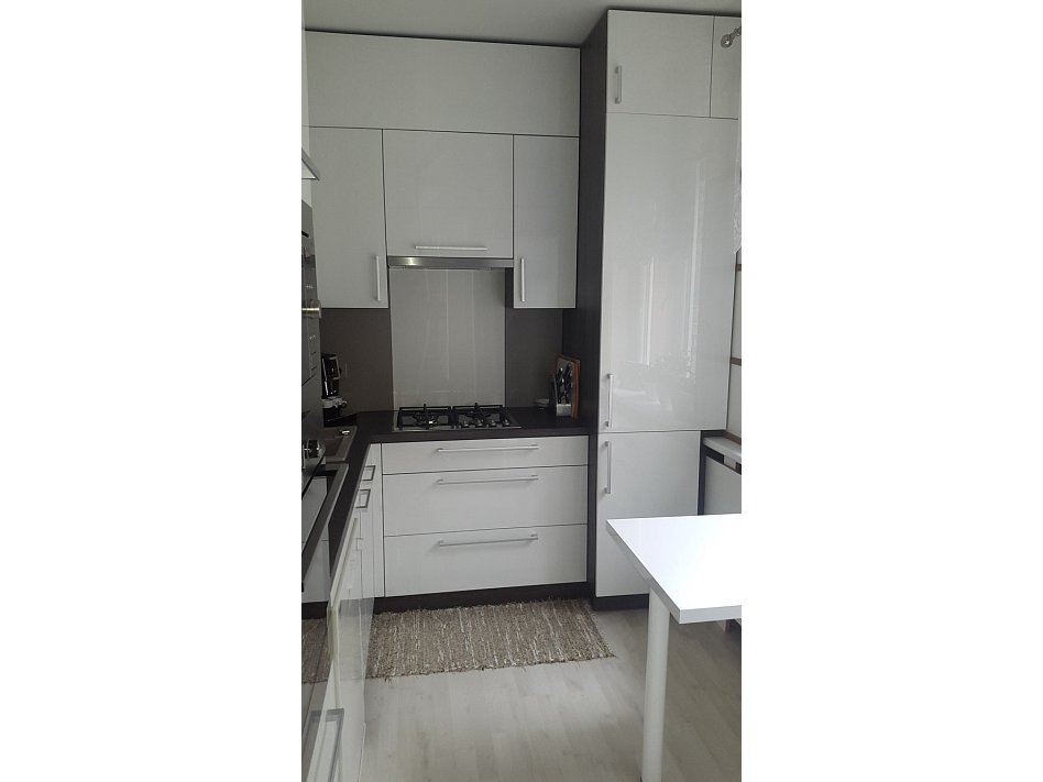 Při návrhu kuchyně jsme byli značně omezeni prostorem malého panelákového bytu. Proto jsem navrhnul bílou lesklou barvu s kombinací krémové a tmavé pracovní desky, tím jsem docílil toho že kuchyně nijak pocitově nezmenšuje prostor.